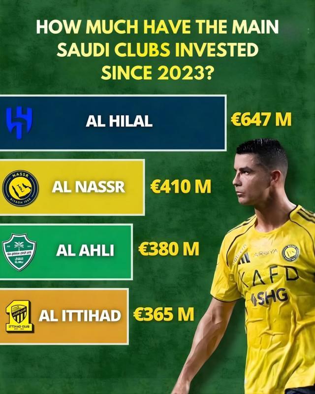 2023年以来,沙特各大俱乐部引援力度对比,利雅得新月遥遥领先。